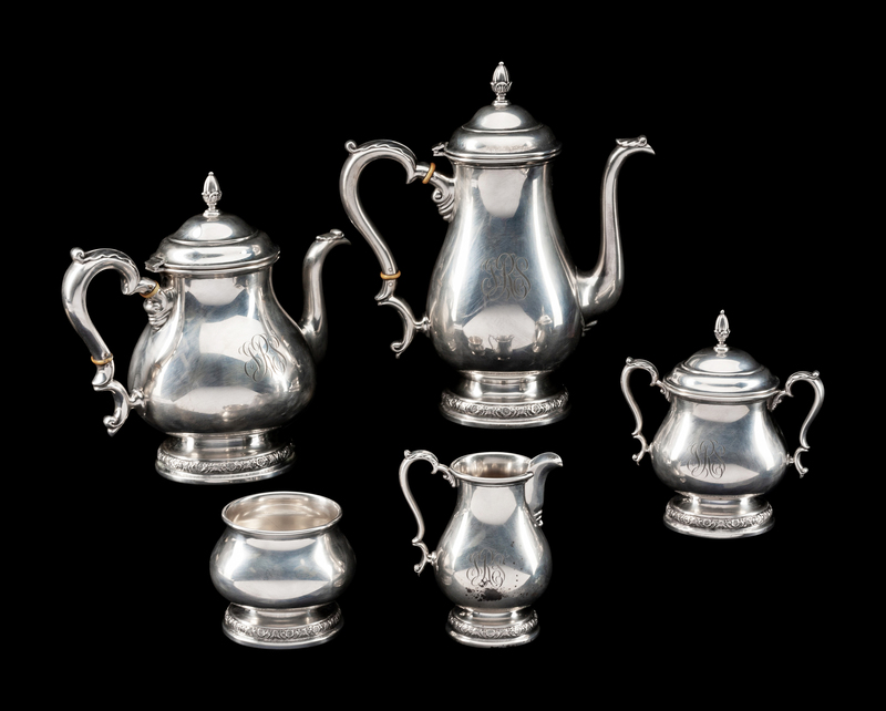 Prelude pattern, comprising a teapot, coffee pot, creamer, covered sugar and waste bowl, each with an engraved monogram.