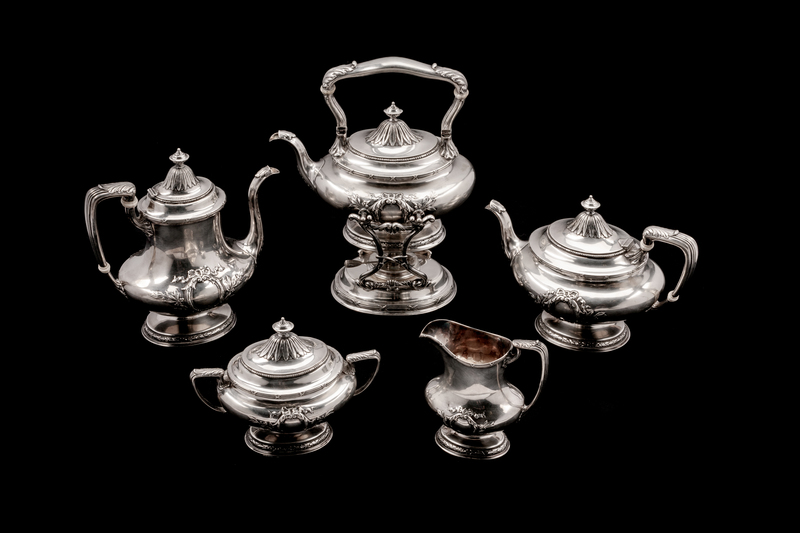 comprising a kettle on stand, teapot, coffee pot, creamer and covered sugar.