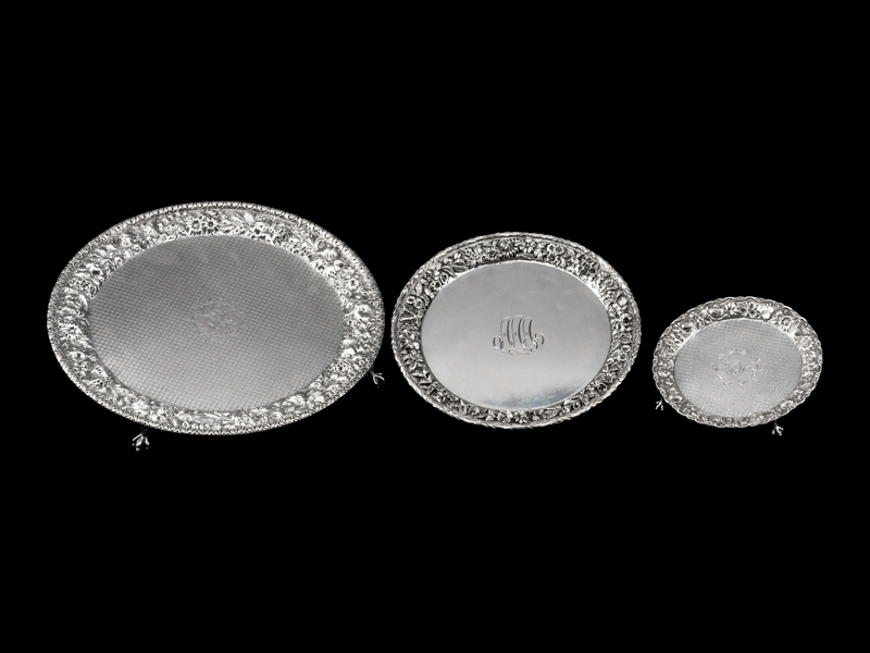 comprising two examples by S. Kirk & Son and a smaller example by A.G Schultz, each having a rim worked with repousse decoration.