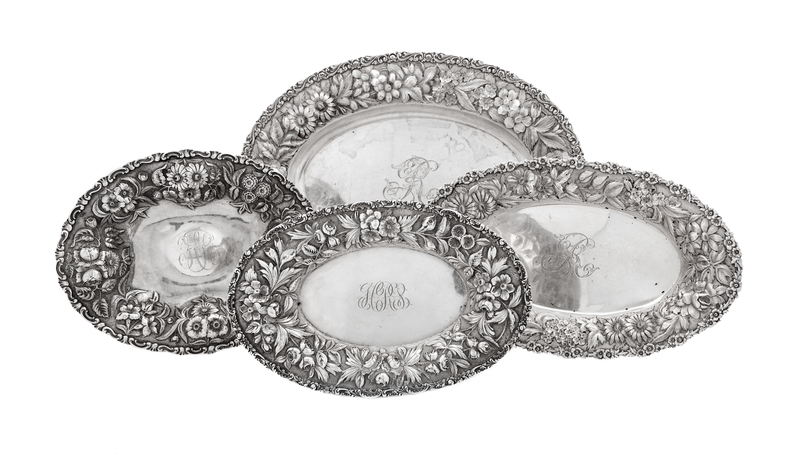each of oval form, the borders with repousse floral decoration and centered with an engraved monogram.