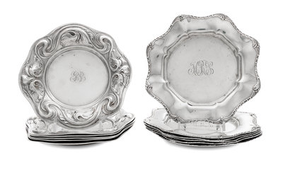 comprising a set of 6 by R. Wallace & Sons Mfg. and a set of 6 by Woodside Sterling Co., each centered with an engraved script monogram