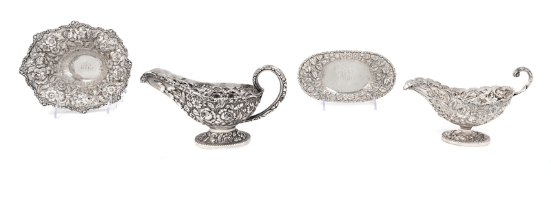 each decorated with repousse floral decoration, comprising two sauce boats a candy dish and a butter dish.