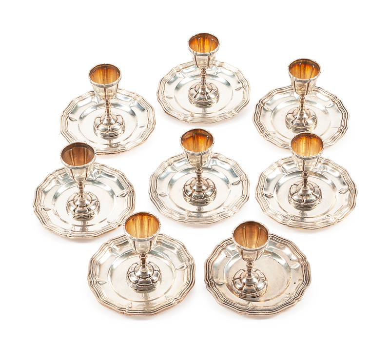 A Set of Eight Mexican Silver Cordials and Eight Small Plates