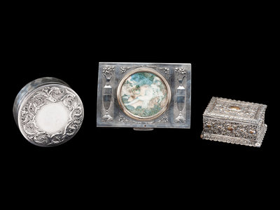 the lid centered by a painted roundel depicting a reclining nude set within an 18-karat gold frame, together with a Continental silver box and a silver-plate article.