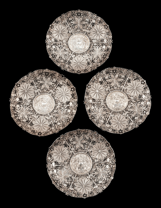 the filigree borders surrounding a central roundel worked to show repousse writhing dragons chasing the flaming pearl.