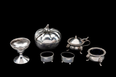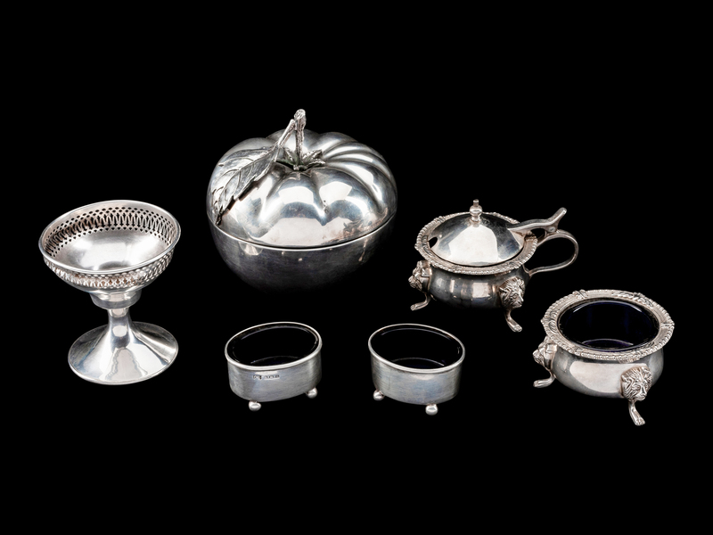 comprising a pair of English silver salt cellars, a silver demitasse cup liner and an Italian silver tomato-form table casket, together with a silver-plate salt cellar and mustard pot.