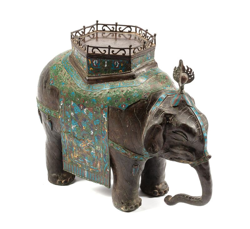 A Chinese Patinated Bronze and Cloisonne Figure of an Elephant