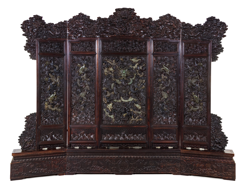 A Large Chinese Carved Hardwood Five-Panel Screen