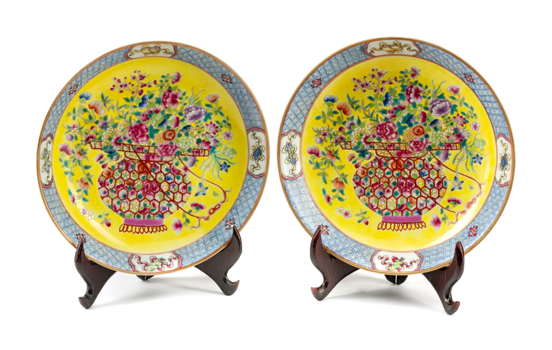 A Pair of Chinese Famille Jaune Porcelain Plates