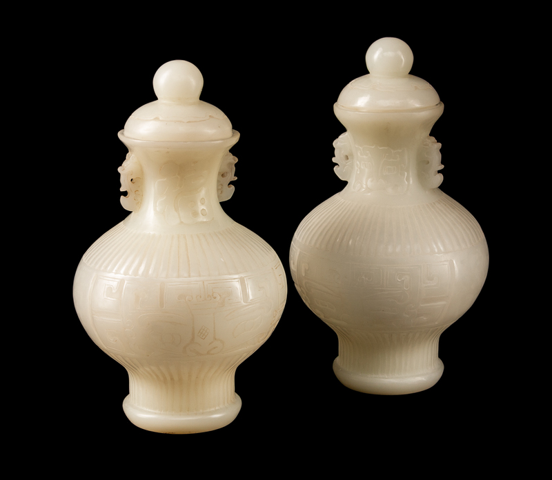 A Pair of Chinese Peking Style Glass Vases and Covers