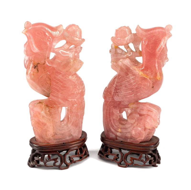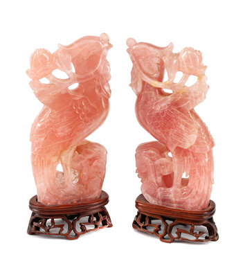 A Pair of Chinese Carved Rose Quartz Birds