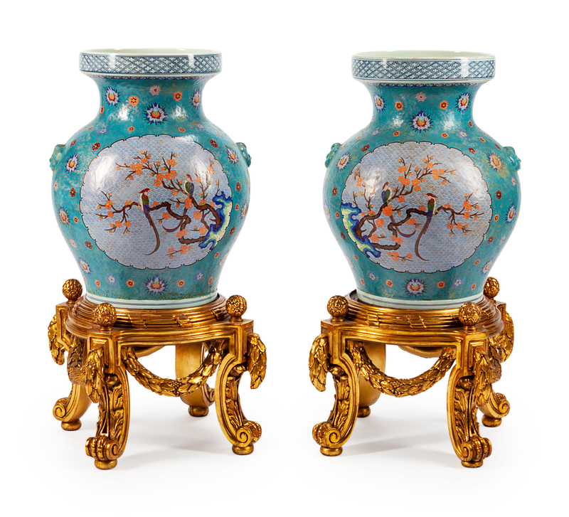 A Pair of Monumental Chinese Export Porcelain and Cloisonne Urns
