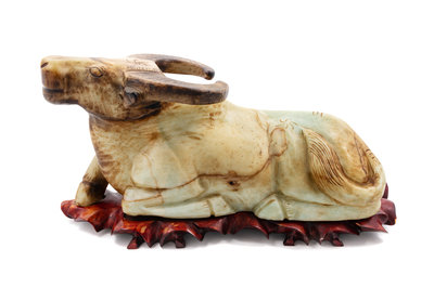 A Large Chinese Carved Hardstone Model of a Bull and Stand
