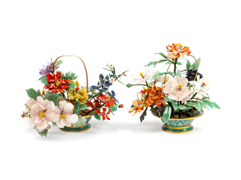 A Pair of Chinese Carved Semi-Precious Stone Baskets on Cloisonne Bases