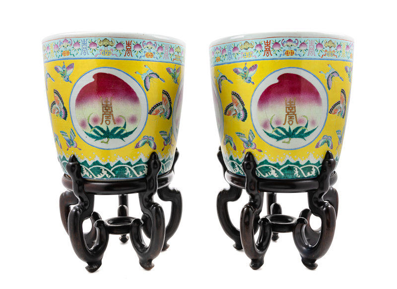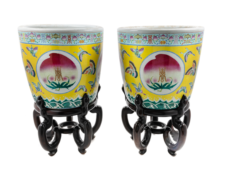 A Pair of Chinese Porcelain Jardinieres and Stands