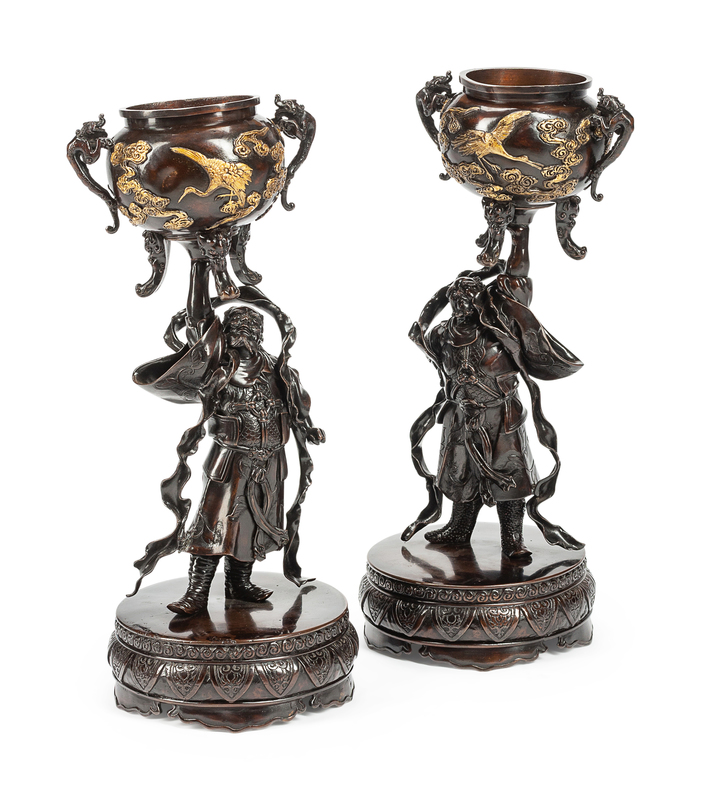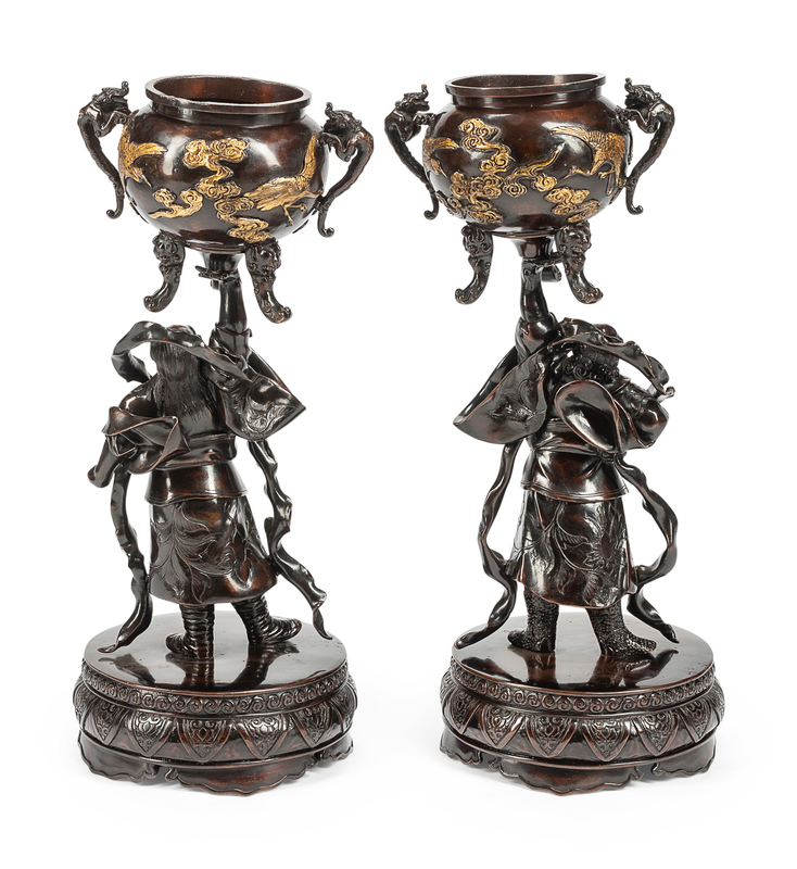A Pair of Japanese Gilt and Patinated Bronze Figural Censers