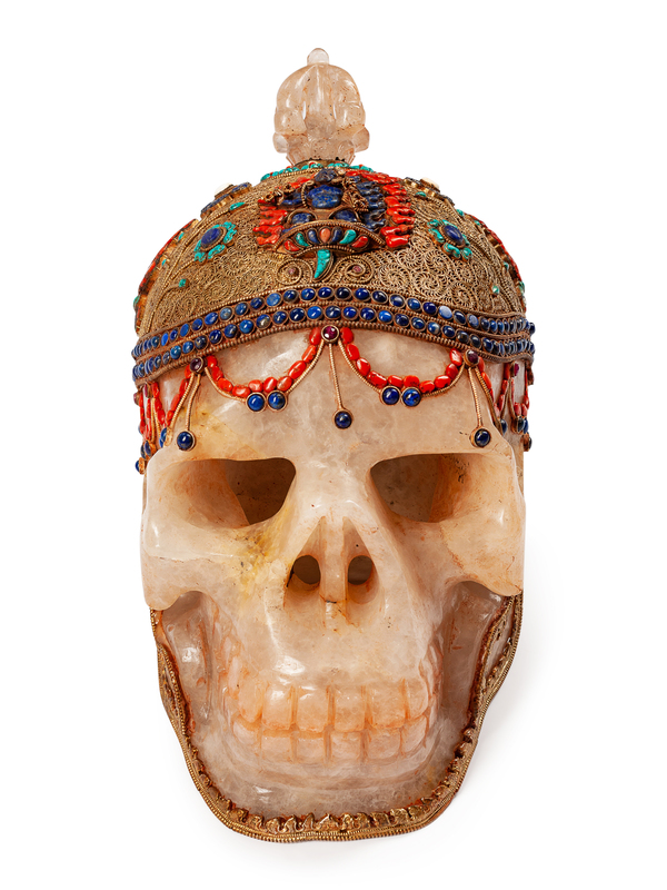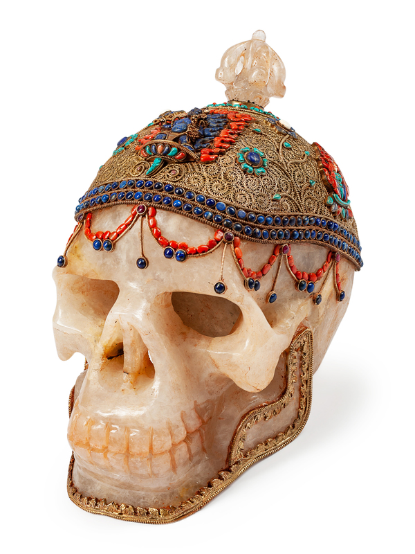 A Large Tibetan Style Silver Filigree, Lapis Lazuli, Coral and Turquoise Mounted Rock Crystal Skull