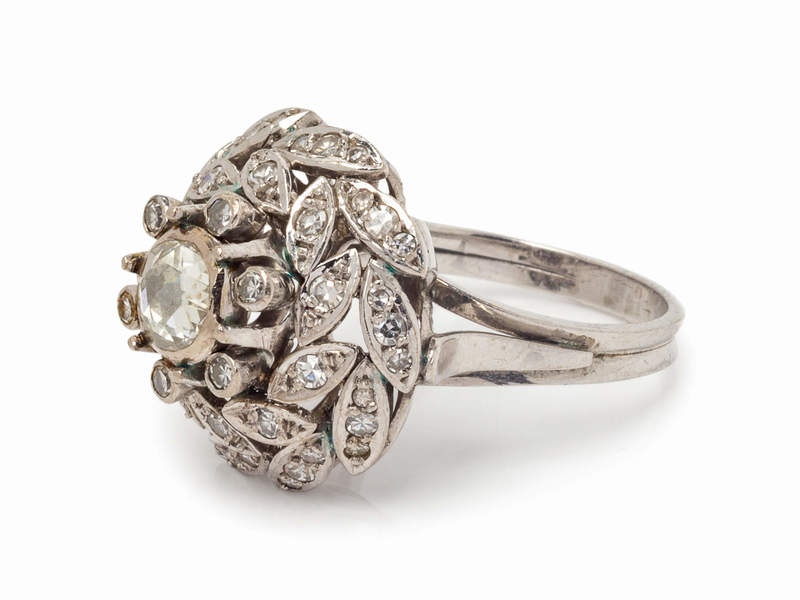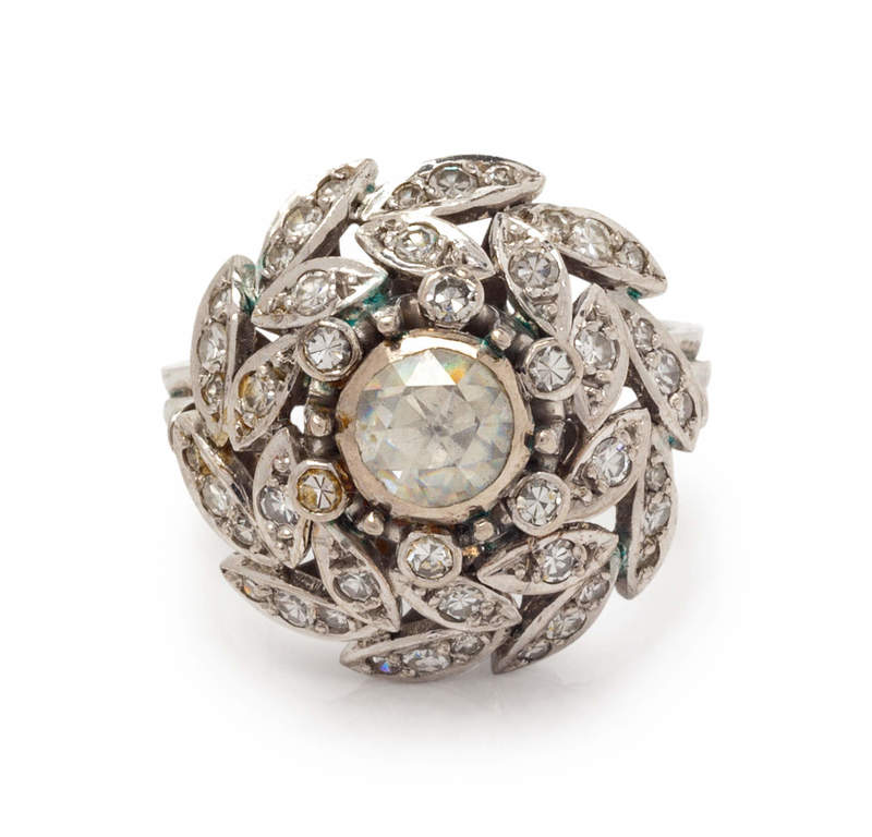 containing one rose cut diamond measuring approximately 5.75 mm in diameter and 46 single cut diamonds weighing approximately 0.30 carat total.
