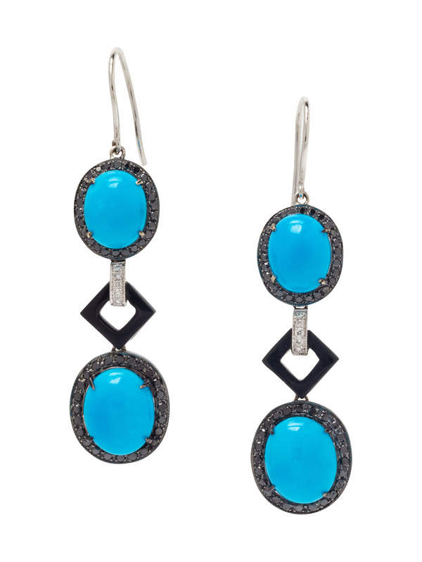 A Pair of 18 Karat White Gold, Turquoise, Black Diamond, Diamond and Onyx Earrings,