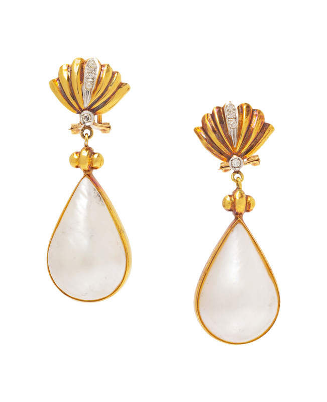 containing two pear shape mabe pearls measuring approximately 21.79 x 14.30 x 7.10 mm and eight round single cut diamonds, posts with clip backs.