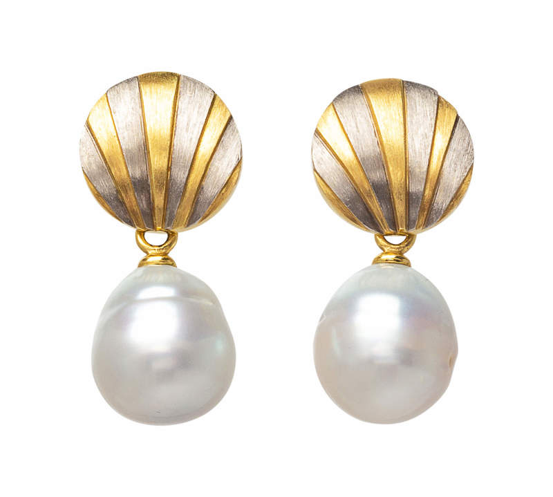 A Pair of Bicolor Gold and Cultured Pearl Drop Earrings,