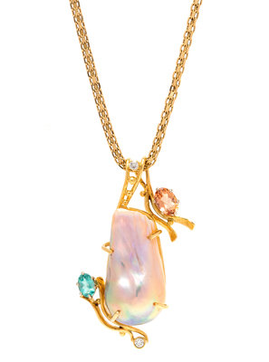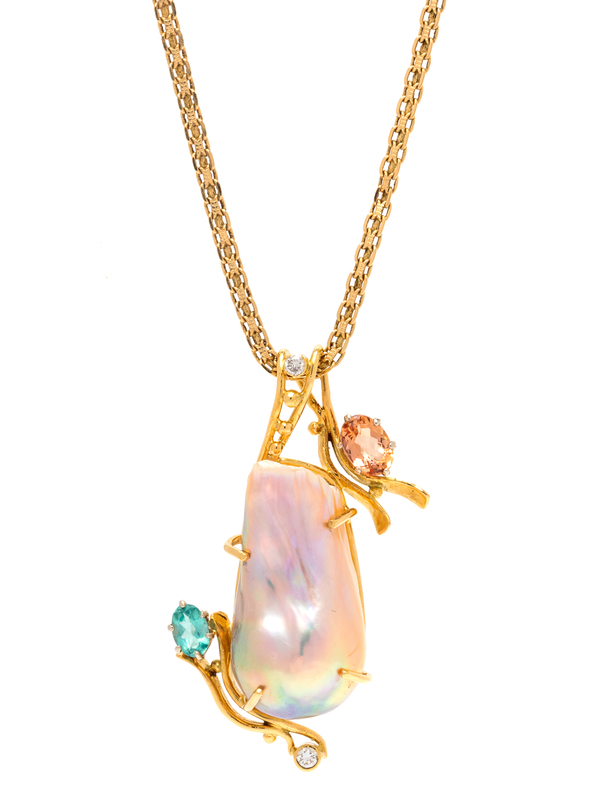 A Yellow Gold, Cultured Baroque Pearl, Diamond and Gemstone Simulant Pendant/Necklace,