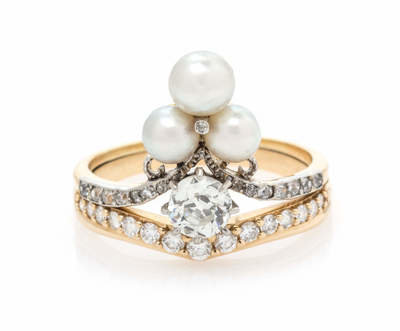 containing one old European cut diamond weighing approximately 0.55 carat, three pearls (origin not tested) measuring approximately 4.89-5.54 mm in diameter, and 30 round brilliant and old mine cut diamonds weighing approximately 0.45 carat total.