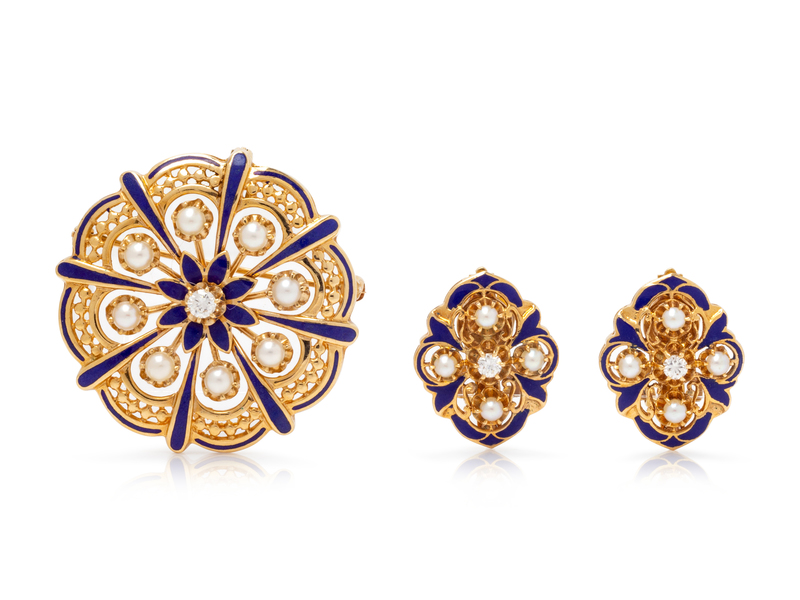 A Yellow Gold, Cultured Pearl, Diamond and Enamel Demi Parure,
