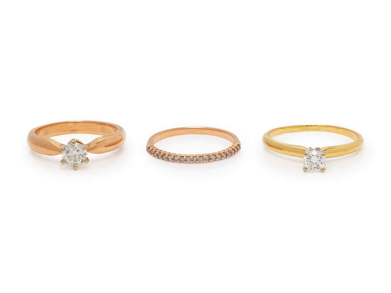 consisting of a 14 karat rose gold ring containing one round brilliant cut diamond weighing approximately 0.50 carat, a 14 karat rose gold band containing 19 round brilliant cut diamonds weighing approximately 0.10 carat total, together with a yellow gold ring containing one round brilliant cut diamond weighing approximately 0.35 carat.