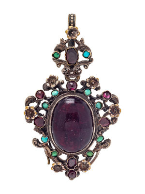 containing a center oval cabochon garnet as well as 8 garnets of varying size and shape and 10 round cabochon turquoise in a floral motif pendant with glass back.