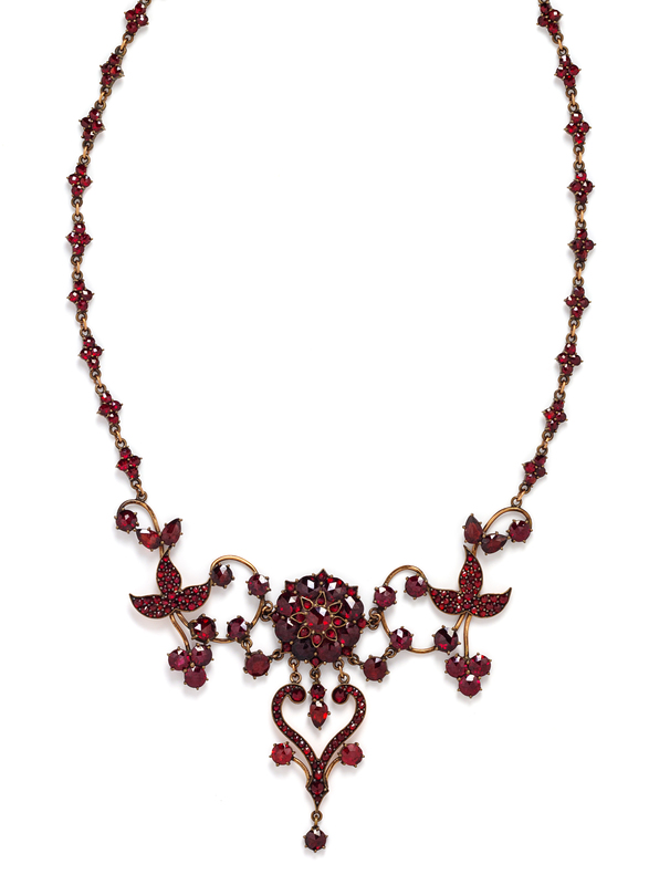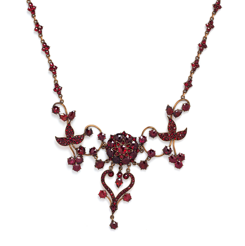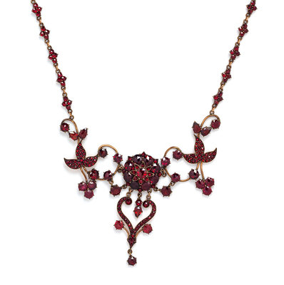 consisting of a central scrolling floral cluster with drops and navette shape chain containing numerous rose cut garnets.