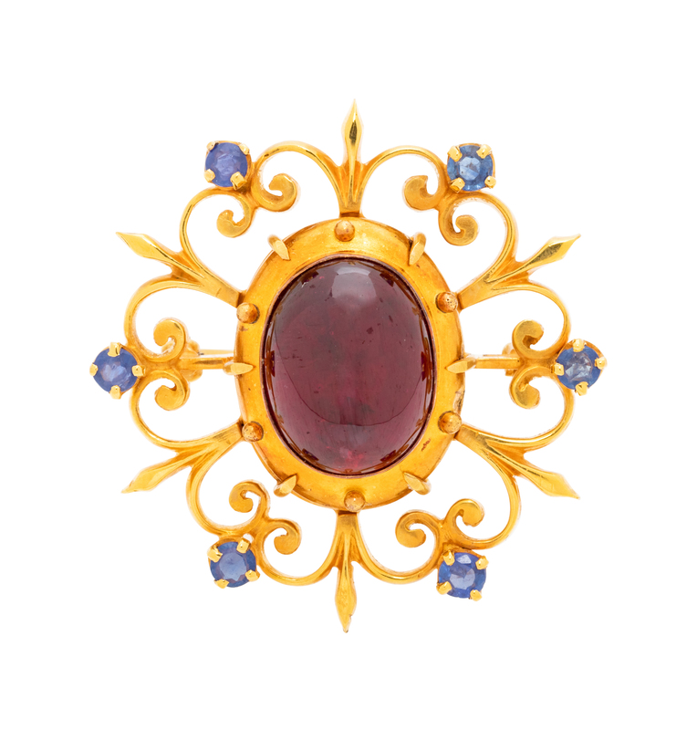 A Yellow Gold, Red Gemstone and Sapphire Pendant/Brooch,