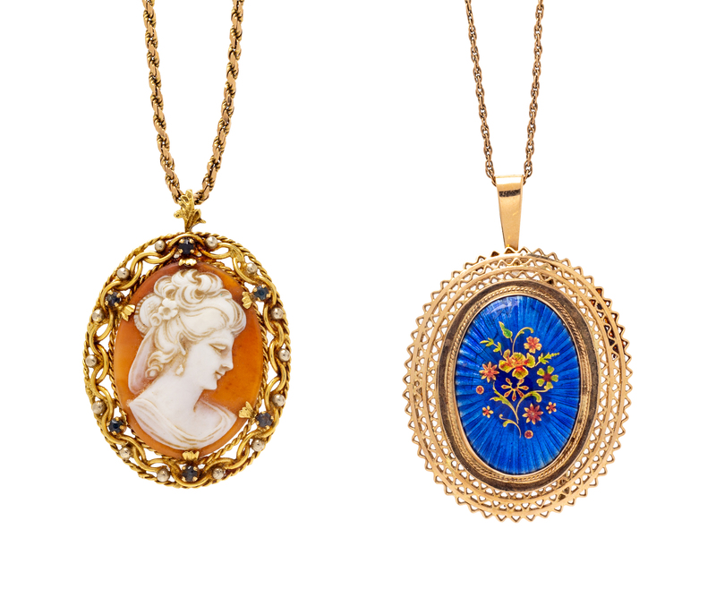 consisting of a pendant/brooch containing one oval shape carved cameo depicting the portrait of a woman with twisted gold surround containing six round mixed cut gemstones suspended from an Italian 14 karat yellow gold rope chain, together with an Israeli 14 karat yellow gold pendant/brooch with floral motif polychrome translucent enamel suspended from a yellow gold rope chain.