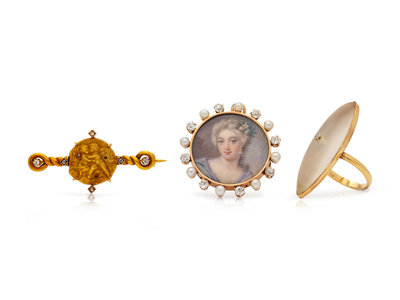 consisting of a rose gold pendant/brooch containing a painted portrait of a woman, eight pearls (origin not tested) and eight old mine cut diamonds weighing approximately 0.60 carat total, a 14 karat ring containing one navette shape rock crystal and one round brilliant cut diamond, together with an 18 karat brooch with central section depicting two figures embracing signed L. BLANCHOT, with twisted wire surround and seven mixed cut diamonds.