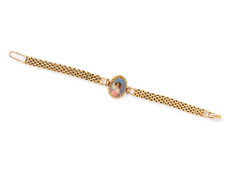 consisting of an oval shape painted portrait of a woman with a mesh link bracelet.