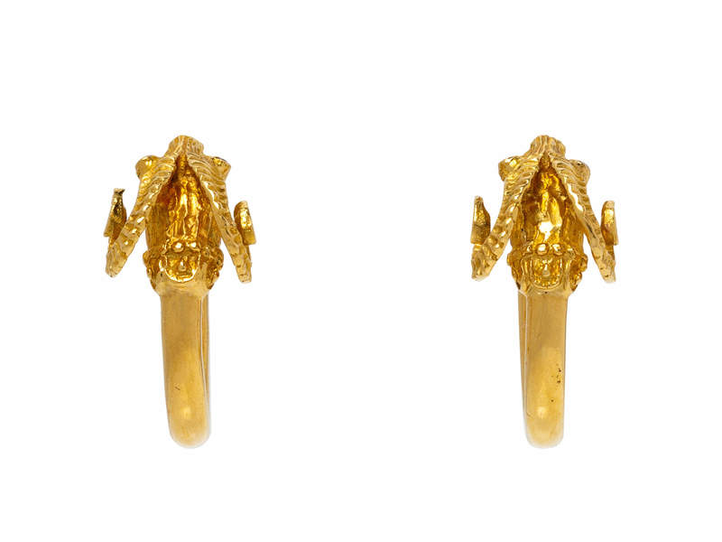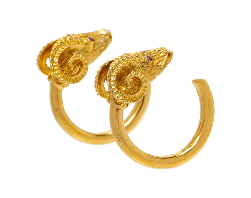 consisting of hoop earrings with a ram's head motif with ruby eyes.