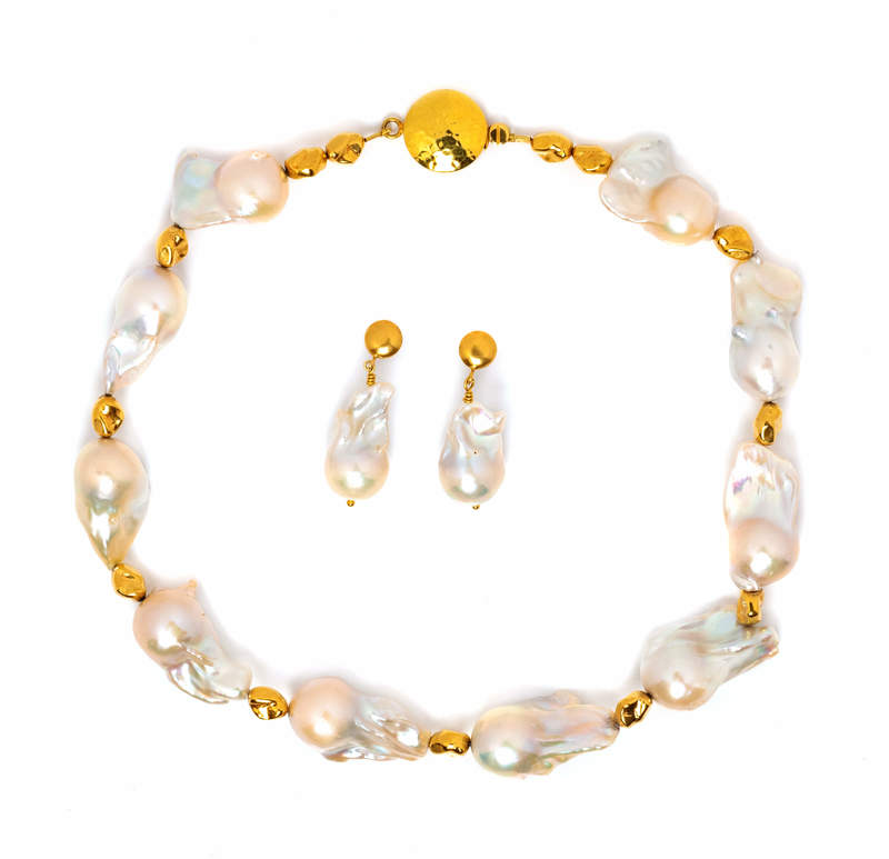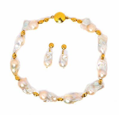 consisting of a necklace containing ten Baroque pearls measuring approximately 30.00 x 15.00 mm and 13 gold spacers, together with a pair of drop earrings containing two Baroque pearls measuring approximately 25.00 x 15.00 mm.