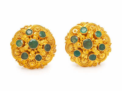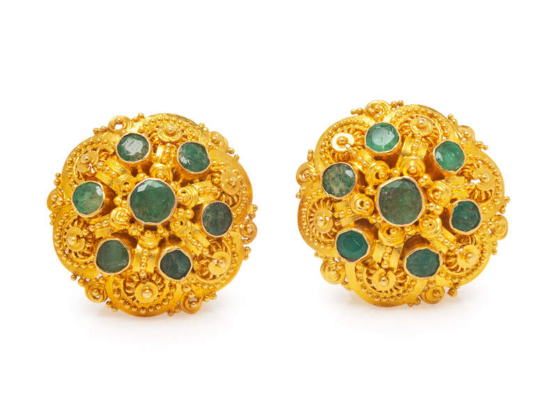 containing 14 round mixed cut emeralds measuring approximately 2.15-3.20 mm in diameter, with applied texture and granulation detail.