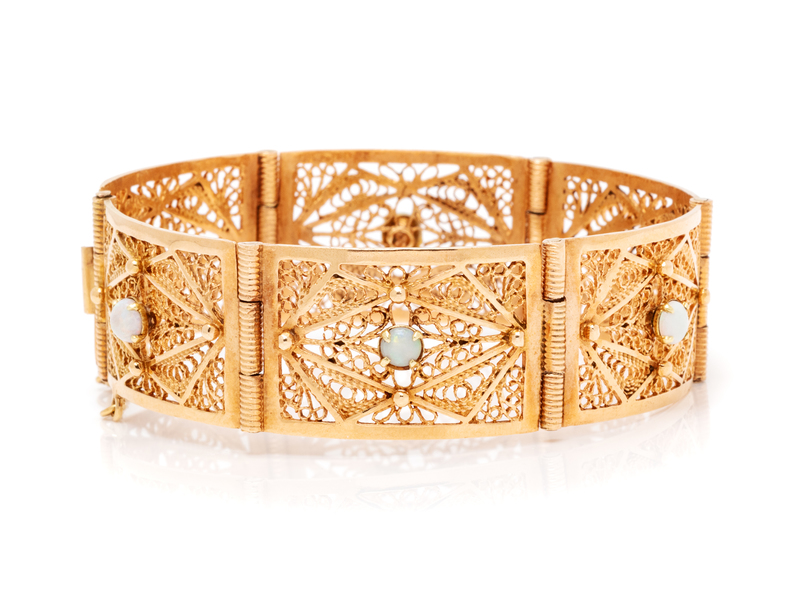 consisting of six curved hinged filigree panels containing six round cabochon cut opals measuring approximately 3.80-4.50 mm in diameter.