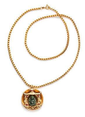 A 14 Karat Yellow Gold, Hardstone and Ruby Pendant/Necklace,