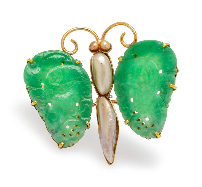 A 14 Karat Yellow Gold, Jade and Cultured Pearl Butterfly Brooch,