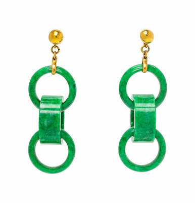 consisting of interlocking green hardstone rings suspended from yellow gold studs with posts.