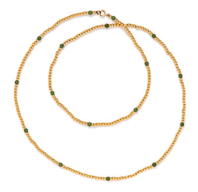 consisting of yellow gold beads measuring approximately 3.00 mm and accented with green hardstone beads.