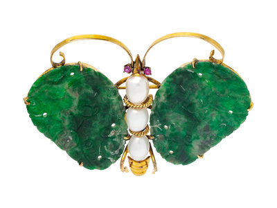 A 14 Karat Yellow Gold, Jade, Cultured Pearl and Pink Sapphire Butterfly Brooch,