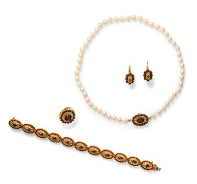 consisting of an 18 karat Italian bracelet containing 11 oval shape mixed cut and numerous round mixed cut garnets, a pair of 18 karat earrings containing 18 round mixed cut garnets, a ring containing one round mixed cut garnet measuring approximately 7.75 mm in diameter and 16 round mixed cut garnets, together with a necklace containing cultured pearls measuring approximately 5.90 mm in diameter, strung knotted with a clasp containing one oval shape mixed cut garnet and 14 round mixed cut garnets.