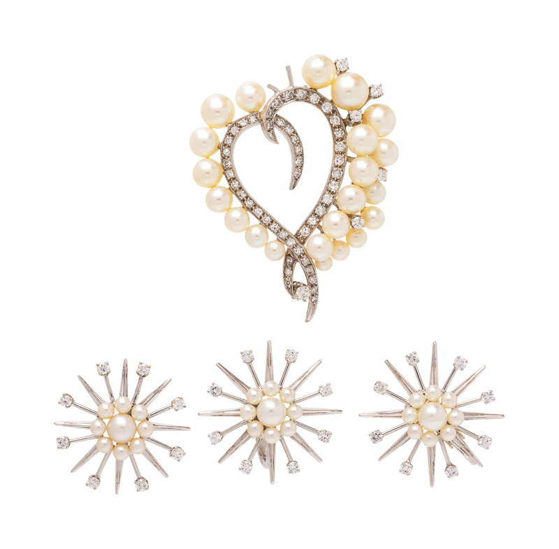 consisting of a heart motif brooch containing 22 pearls and 57 round brilliant and single cut diamonds weighing approximately 0.50 carat total, together with three earclips containing 27 pearls and 24 round brilliant cut diamonds weighing approximately 0.70 carat total.