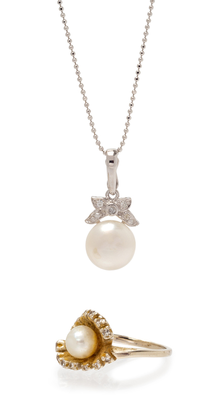 consisting of a 14 karat gold necklace containing one button pearl measuring approximately 10.00 mm and seven single and round brilliant cut diamonds and a ring containing one pearl measuring approximately 6.60 mm in diameter and 14 single cut diamonds.