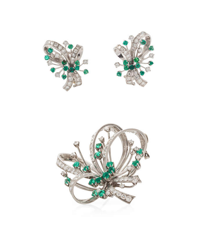 consisting of a pendant/brooch containing 14 round mixed cut emeralds measuring approximately 2.60-3.10 mm in diameter and 64 round brilliant and single cut diamonds weighing approximately 1.80 carats total, together with a pair of earclips containing 22 round mixed cut emeralds measuring approximately 1.75-2.30 mm in diameter and 44 round brilliant and single cut diamonds weighing approximately 0.80 carat total, posts with clip backs.