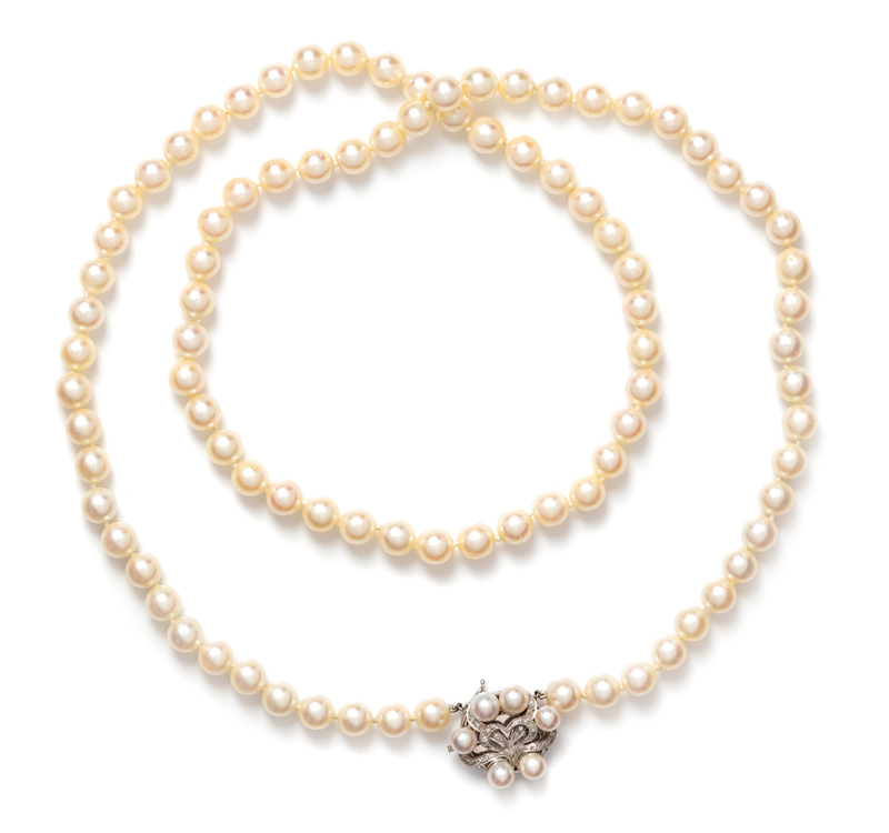 containing 90 pearls measuring approximately 8.10 mm in diameter, strung knotted with a clasp containing six pearls and 20 single cut diamonds weighing approximately 0.10 carat total.