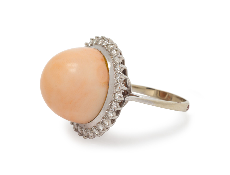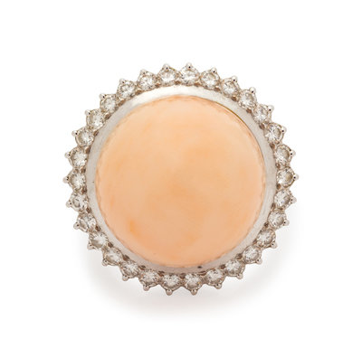 containing one cabochon cut coral measuring 16.95 x 12.55 mm and 30 round brilliant cut diamonds weighing approximately 0.60 carat total.